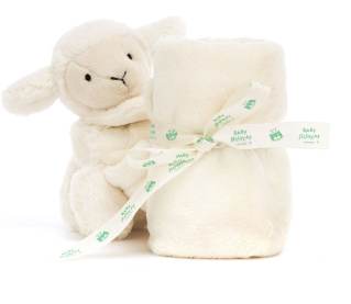 Sweet, gentle Bashful Lamb Soother is a perfect newborn gift, rolled up and presented in a Baby Jellycat grosgrain ribbon. Featuring our most loved farmyard friend, soft in a vanilla cream fur made from recycled fibres and holding on tight to a smooth, un-stuffed square shaped soother; a simply gorgeous cuddle companion.