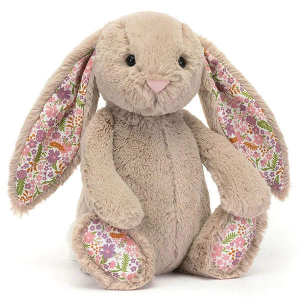 Blossom Beige Bunny has been frolicking in the meadows, collecting special flowers along the way. With soft beige fur, a cream bobtail, and cotton floral ears and feet adorned with pink and purple blooms, this bunny brings floral joy to all ages!