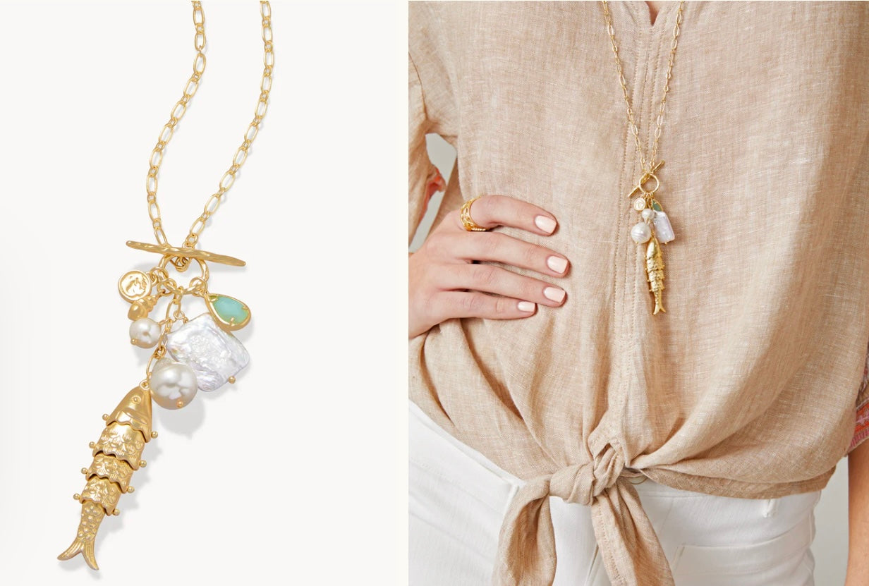 A golden fishy charm dangles alongside freshwater pearls, blue glass, and white opal glass crystals, showing off the wonders of the sea in our Charlie Necklace. Feel all the coast vibes with this 18 KT matte gold plated necklace!