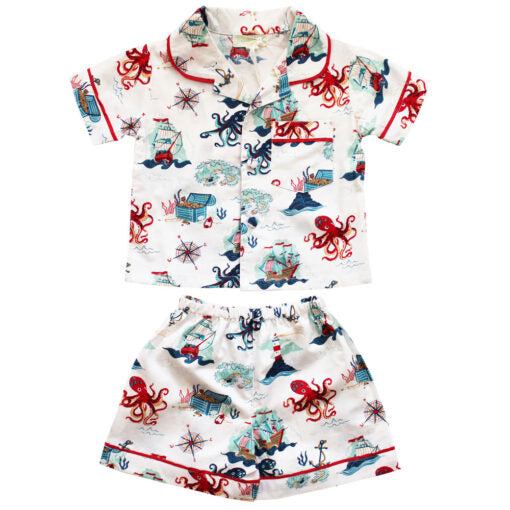 These cool cotton pyjamas shorts and short-sleeved jacket are ideal for warmer nights. Have a swashbuckling adventure with our new high seas print, discover red and blue octopuses, pirate ships, detailed maps and treasure chests all depicted against a white background. The print is complimented by the contrasting blue piping on the sleeves, hems, pockets and around the collar. The shorts are elasticated for comfort and the short-sleeve jacket fastens with fabric-covered buttons. Do not wash over 50 degrees.