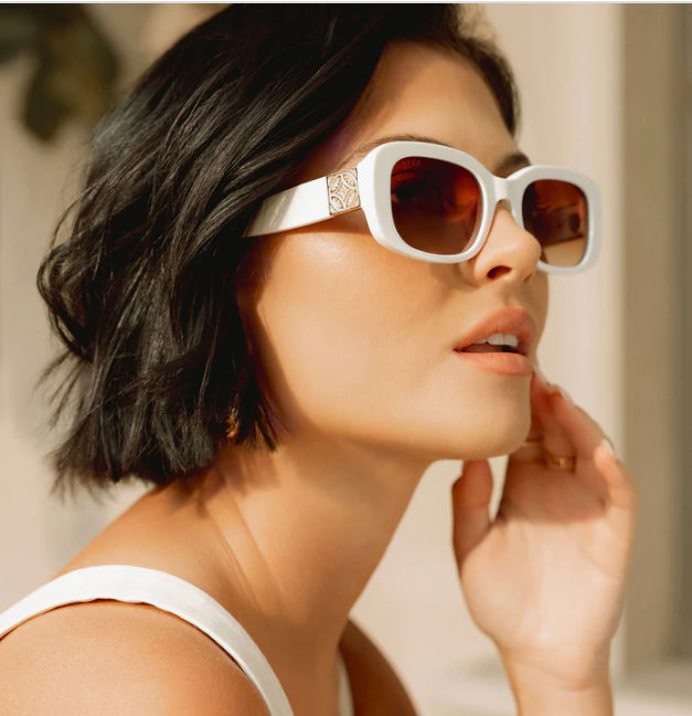 Jetset to Italy and immerse yourself in fashion, culture, and class. With elevated round edges, luxe thick arms, and elegant ivory and gold tones, these sunglasses are made for strolling the piazza or lounging on a yacht. Gold core wires in an artistic Venetian pattern add the perfect finishing touch. Every angle captures pure elegance.